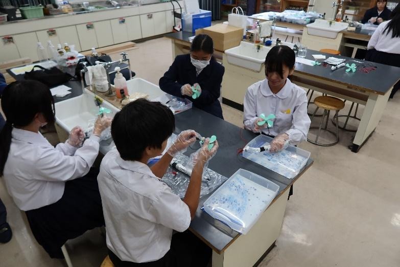 身の回りにある材料で作った木炭電池で回るプロペラに感動しながら、「どうして回るんだろう」とつぶやく生徒たち。この体験を今後の学びにつなげてほしいと思います。