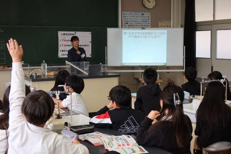 授業の中でいろいろな場所から流れ、集まってくる生活用水がそのまま川に流れこんでいる写真を見て、下水処理施設の大切さに気付き、自分たちにはどんな工夫ができるか考えることができました。今日の学びを今後の生活に活かしてほしいと思います。