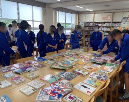 見本図書を図書室に展示し、生徒自らの投票によって本を購入するというイベント「選書会」を実施しました。今年度は、1週間開催し、国語の授業や補充学習の時間を使って、全生徒が参加しました。また、図書室が教室棟と別館にあることから、本館の空き教室をミニ図書館(ブックカフェ)として開館し、さらなる読書活動の推進を図りました。